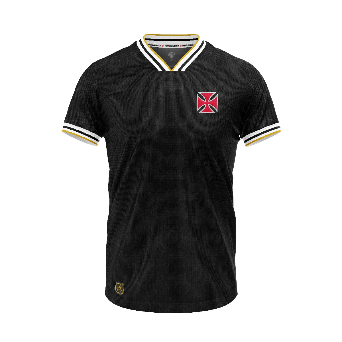 Em gola "V", no modelo jacquard com desenhos do escudo do Vasco ao fundo da camisa, além do escudo bordado do lado esquerdo do peito.